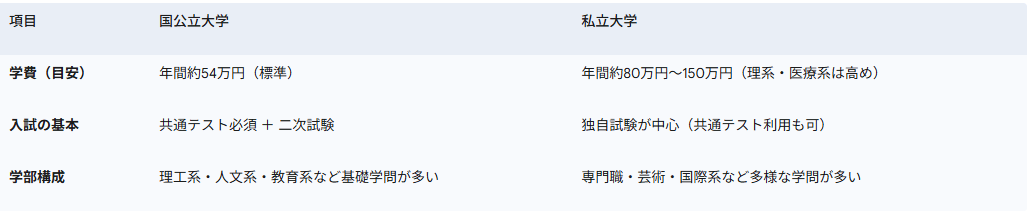 - 入試: 共通テストを利用する場合もありますが、多くは各大学独自の一般選抜が中心です。科目数が国公立より少ない場合もあり、得意科目で勝負しやすい側面があります。